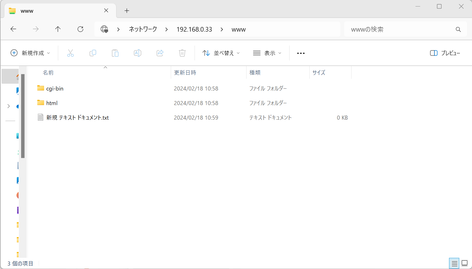 Samba で共有したディレクトリを Windows のエクスプローラで表示することができるか確認しました。エクスプローラのアドレスバーに「\\192.168.0.33\www」を入力して接続します。(IPアドレスはRaspberry PiのIPアドレスを指定します)